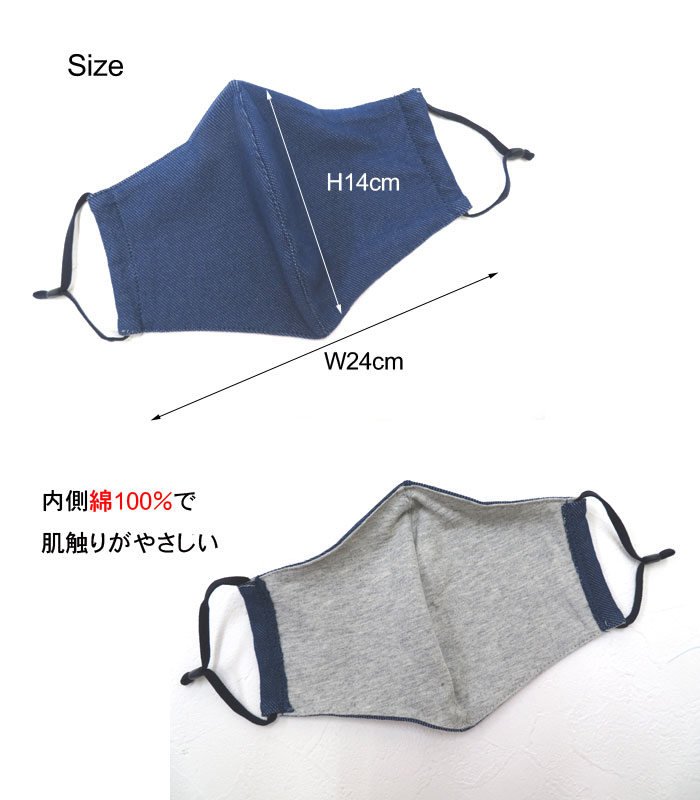 商品名 デニムマスク 品番 8407 素材 本体 表側:ポリエステル 内側:綿 付属:ナイロン ポリウレタン ノーズワイヤー:ポリエチレン サイズ タテ約14cm×ヨコ24cm 生産国 中国製 特徴 おしゃれなデニムマスクになります。