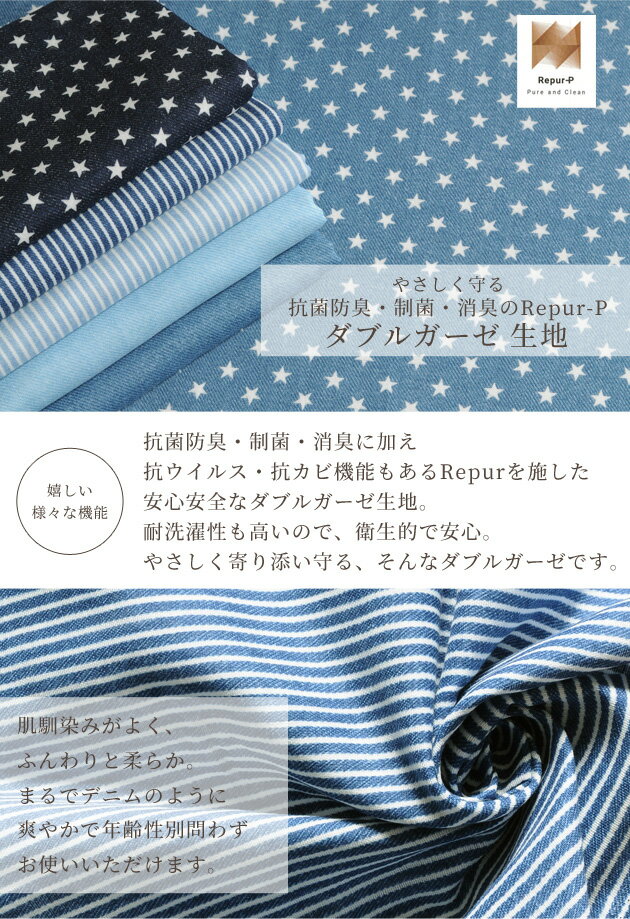 )抗菌防臭・制菌・消臭のRepur-P国産 デニム風 ダブルガーゼ 生地 全6種50cm単位カット販売抗菌防臭・制菌・消臭に加え、抗ウイルス・抗カビ・食品性防汚・花粉脱落機能もある「Repur-P レピュール・プレミアム」を施した安心安全なダブルガーゼ生地抗菌防臭・制菌・抗ウイルスの他に花粉症の方にも嬉しい、花粉リリース機能も充実少し払うだけで付着した花粉がほとんど落ち、室内への花粉の侵入を防ぎます。