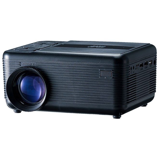 DVDプレイヤーを搭載することで面倒な接続が不要に! 投影サイズ30〜150インチで迫力の大画面投影! スピーカー内蔵でご自宅でのホームシアターを手軽に楽しめます ! ■仕様・本体サイズ(mm):約W205×H95×D160 ・本体重量:約1035g ・明るさ:54 ANSI ルーメン (国内検査済) ・コントラスト:510:1 ・投影サイズ:30-150インチ ・投影距離:約1m~4.2m ・解像度:800×480,サポート1920×1080 ・アスペクト比:4:3/16:9 ・ズーム・フォーカス:マニュアル ・台形補正:マニュアル ・光源寿命:LED/約20,000時間 ・運転音:29dB ・スピーカー:内蔵 (2W×2) ・消費電力:50W ・インターフェース:Audio-out/AV/microSD/HDMI×2/USB2.0/VGA ■対応ファイル ・映像:AVI/MPG/MP4/DAT/VOB/FLV ・音声:MP3/WMA ・静止画:JPG ■対応ディスク ・DVD/DVD-R/DVD-R DL/DVD-RW (VRモード/CPRM記録ディスク含む) ・CD/CD-R/CD-RW ■セット内容 本体、レンズカバー、電源アダプター 100V 50/60Hz (ケーブル長さ:約1.5m) AVケーブル (ケーブル長さ:約1.5m/入力1ピン・出力3ピン) リモコン (単4形乾電池×2本/別売)、取扱説明書/保証書 ■保証期間:ご購入日より6ヶ月 (但し、弊社保証規定に基づきます。