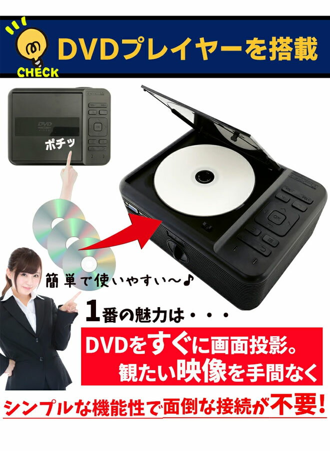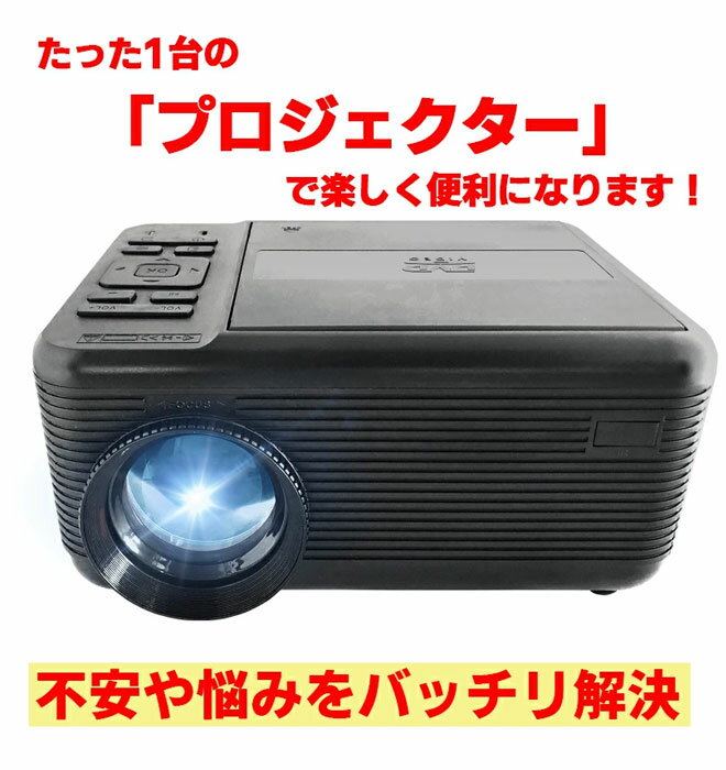 DVDプレイヤーを搭載することで面倒な接続が不要に! 投影サイズ30〜150インチで迫力の大画面投影! スピーカー内蔵でご自宅でのホームシアターを手軽に楽しめます ! 本体サイズ(mm):約W205×H95×D160 重量:約985g 明るさ:80ANSIルーメン (国内検査済) コントラスト:510:1 投影サイズ:30-150インチ 投影距離:約1m〜4.2m 解像度:1280×720、サポート1920×1080 アスペクト比:4:3/16:9 ズーム・フォーカス:マニュアル 台形補正:マニュアル 光源寿命:LED/約20,000時間 運転音:50dB スピーカー:内蔵 (2W×2) 消費電力:50W インターフェース:Audio-out/AV/microSD/HDMI×2/USB2.0/VGA ■対応ファイル 映像:AVI/MPG/MP4/DAT/VOB/FLV 音声:MP3/WMA 静止画:JPG ■対応ディスク DVD/DVD-R/DVD-R DL/DVD-RW (VRモード/CPRM記録ディスク含む) CD/CD-R/CD-RW ■セット内容 本体、レンズカバー、電源アダプター 100V 50/60Hz (ケーブル長さ:約1.5m) AVケーブル (ケーブル長さ:約1.5m/入力1ピン・出力3ピン) リモコン (単4形乾電池×2本/別売)、取扱説明書/保証書 プロジェクター DVDプレーヤー 小型 DVD一体型 30〜150インチ スピーカー内蔵 家庭用 大画面 簡単接続 ホームシアター 会議 プレゼン DVD CD USB microSD HDMI 映画鑑賞 映画 音楽鑑賞 DVD鑑賞 送料無料プロジェクター DVDプレーヤー 小型 DVD一体型 30〜150インチ スピーカー内蔵 家庭用 大画面 簡単接続 ホームシアター 会議 プレゼン DVD CD USB microSD HDMI 映画鑑賞 映画 音楽鑑賞 DVD鑑賞 送料無料